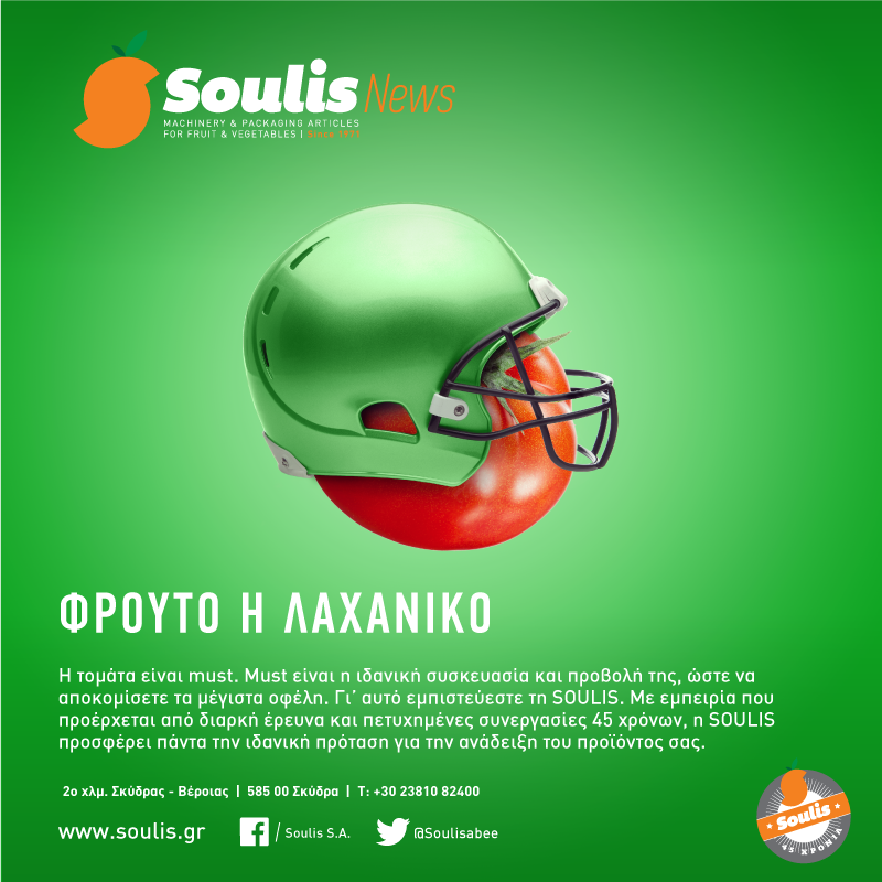 Η τομάτα είναι must. Must είναι και η ιδανική συσκευασια και προβολή της, ώστε να αποκομίσετε τα μέγιστα οφέλη. Γι'αυτό εμπιστεύεστε τη SOULIS. Με εμπειρία που προέρχεται από διαρκή έρευνα και πετυχημένες συνεργασίες 45 χρόνων , η SOULIS προσφέρει πάντα την ιδανική πρόταση για την ανάδειξη του προϊόντος σας.