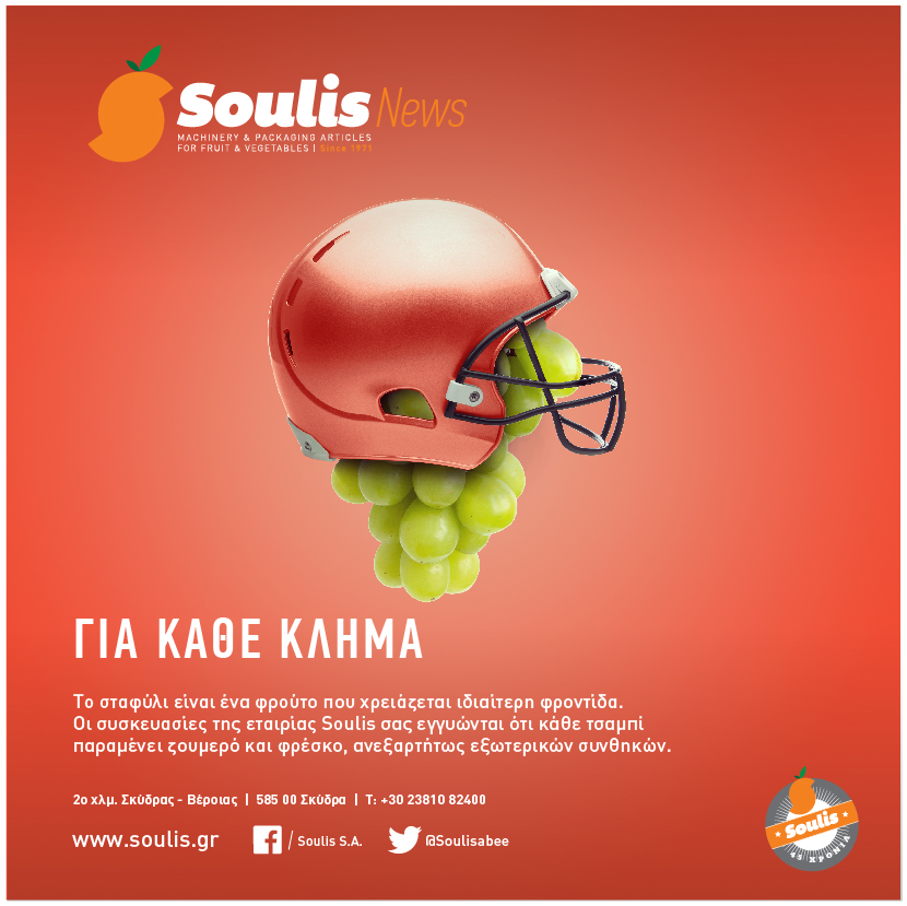 Το σταφύλι είναι ένα φρούτο που χρειάζεται ιδιαίτερη φροντίδα. Οι συσκευασίες της εταιρίας Soulis σας εγγυώνται ότι κάθε τσαμπί παραμένει ζουμερό και φρέσκο, ανεξαρτήτως εξωτερικών συνθηκών.