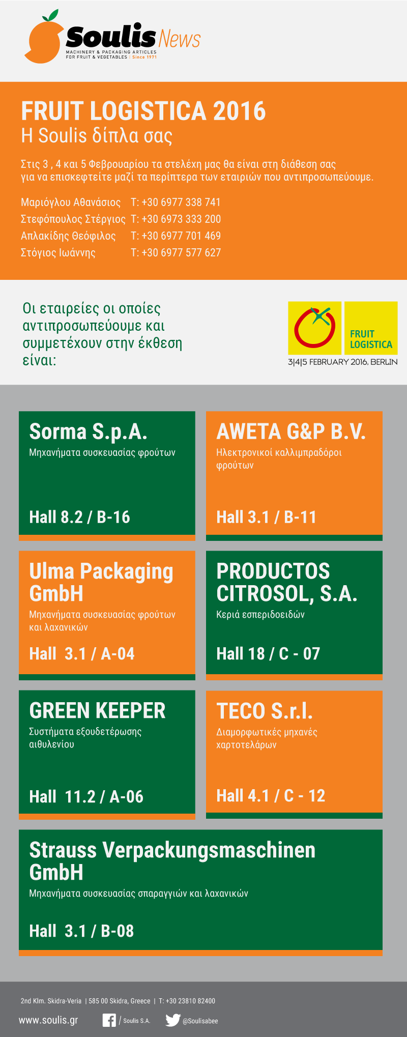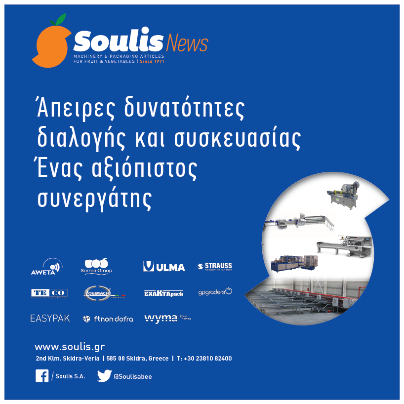 Μην ψάχνετε αλλού. Με εμπειρία και εξέλιξη από το 1971 η Soulis είναι η κορυφαία και ασφαλέστερη επιλογή για υλικά και μηχανήματα συσκευασίας φρούτων και λαχανικών.