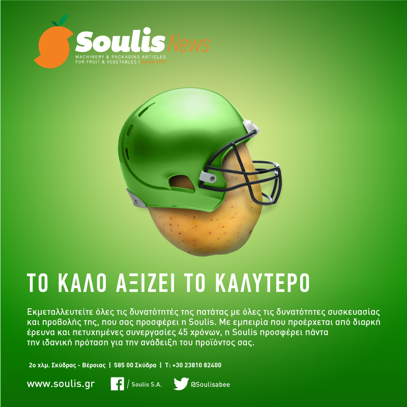 Εκμεταλευτείτε όλες τις δυνατότητες της πατάτας με όλες τις δυνατότητες συσκευασίας και προβολής της , που σας προσφέρει η Soulis. Με εμπειρία που προέρχεται από διαρκή έρευνα και πετυχημένες συνεργασίες 45 χρόνων , η Soulis προσφέρει πάντα την ιδανική πρόταση για την ανάδειξη του προϊόντος σας.