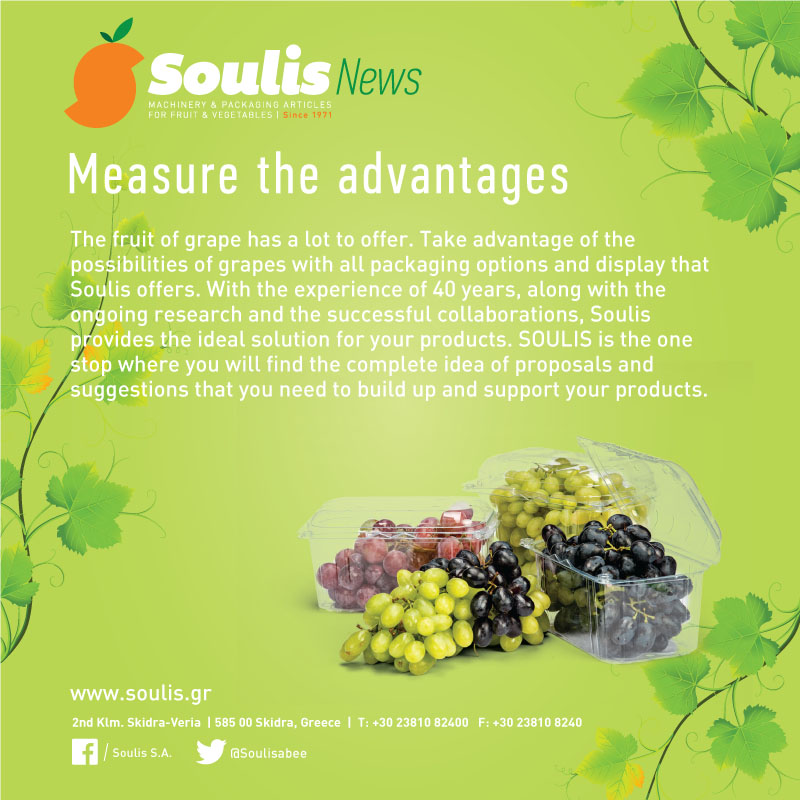The fruit of grape has a lot to offer. Take advantage of the possibilities of grapes with all packaging options and display that SOULIS offers. With the experience of 40 years , along with the ongoing research and the successful collaborations , SOULIS provides the ideal solution for your products. SOULIS is the one stop shop where you will find the complete idea of proposals and suggestions that you need to build up and supposrt your products.